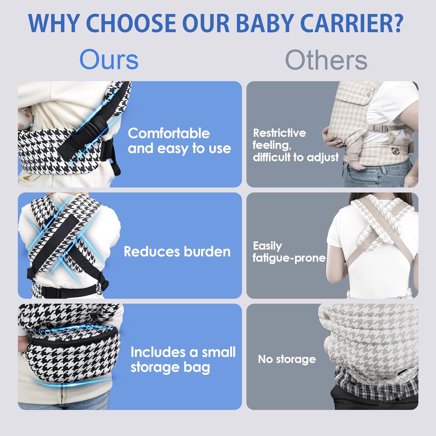 I bought this baby carrier because my newborn decided that being put down is an insult, and my arms were starting to feel like overcooked noodles. The moment I tried this carrier on, I knew we had entered our “hands-free survival era.” The black and white checkerboard design is actually adorable in person, stylish enough that I feel like a trendy parent even when I’m running on 3 hours of sleep and dry shampoo.The M-shaped design is a big win. My baby looks comfy, supported, and positioned exactly the way pediatricians recommend. The head support is sturdy without being stiff, so it keeps my little one secure even when he randomly does his dramatic baby head bobs. The straps adjust easily, and both my husband and I can switch wearers without wrestling the carrier like it’s a puzzle.Comfort-wise, my back gives this a solid thumbs up. I’ve worn it for walks, chores, and even while bouncing on a yoga ball like a desperate parent, no pain. The included storage bag is also handy for tossing it into the car without it becoming a tangled monster.Overall, this carrier made daily life so much easier. Baby’s happy, I’m mobile again, and we both get snuggles. Highly recommend!