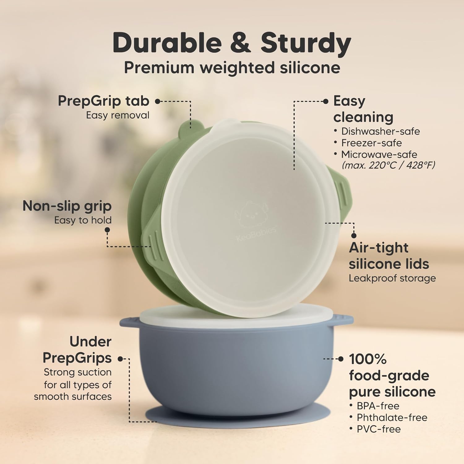Better Silicone – KeaBabies Prep Silicone Suction Baby Bowls with Lids are 100% food-grade, BPA-free. Our toddler bowls are durable, non-toxic with suction bottoms and leakproof lids to prevent spills. Microwave, dishwasher and freezer safe.
