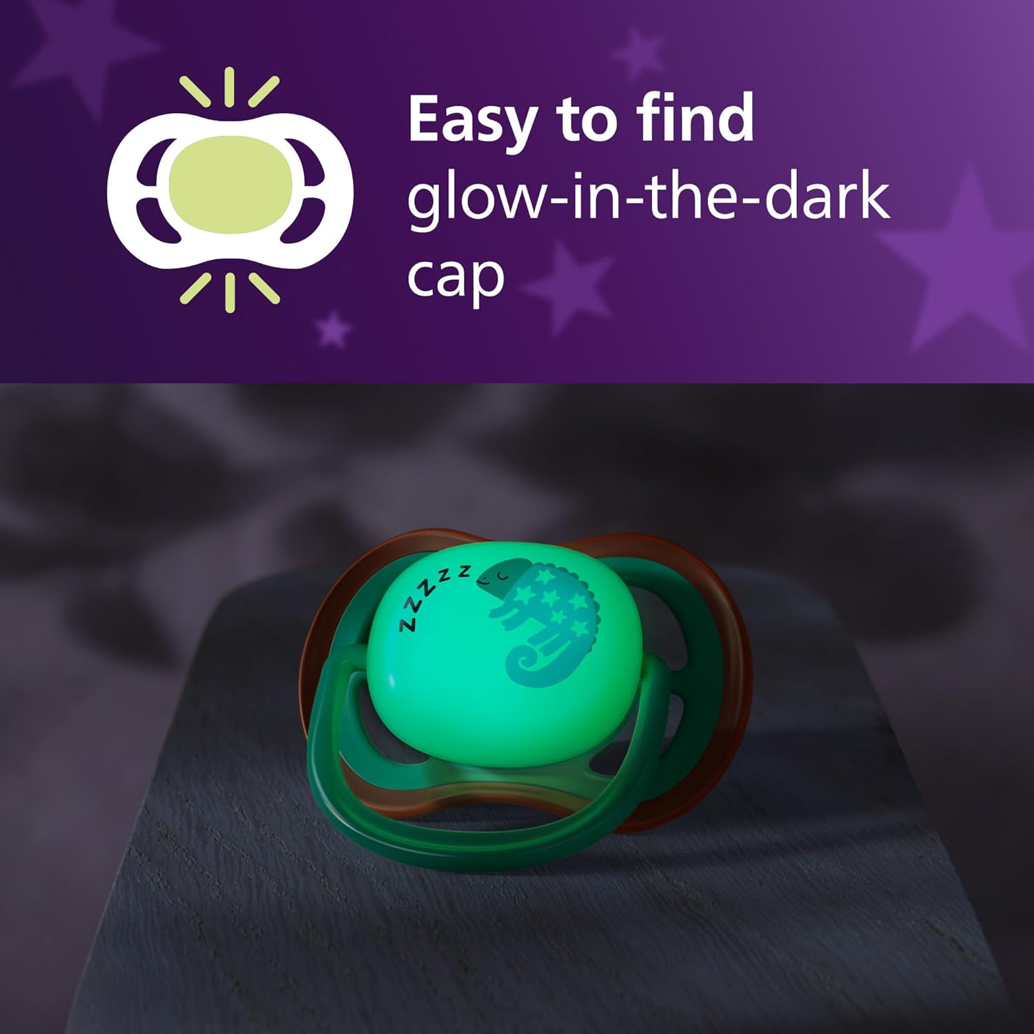 The cap glows in the dark long after lights-out, supporting sleep routines for healthy development; 8 out of 10 parents say Philips Avent Ultra pacifiers help their baby fall asleep²